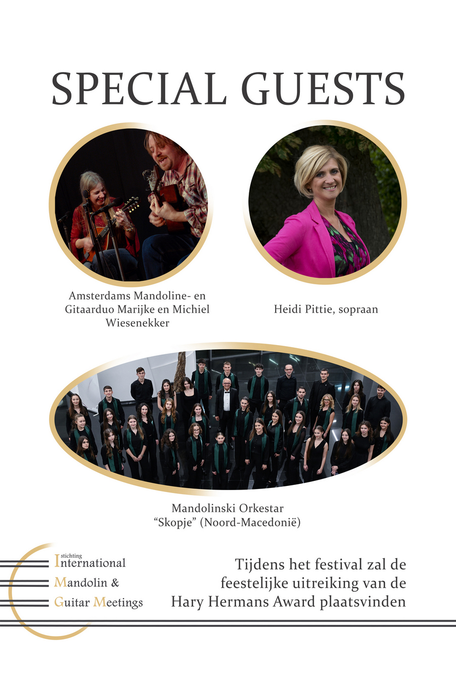 Repetities van het festivalorkest o.l.v. de internationaal zeer bekende mandoliniste, dirigent en bladmuziekuitgever Maren Trekel (D). Daarnaast zijn er optredens van op kwalitatief hoog niveau musicerende orkesten uit Nederland, België, Duitsland, Duo Marijke en Michiel Wiesenekker, soliste Heidi Pittie (sopraan) en onze speciale gast het Mandolinski Orkestar “Skopje” (Noord-Macedonië). Tijdens het weekend zal ook de Hary Hermans Award worden uitgereikt aan een voor de mandoline- en gitaarwereld spraakmakende persoon.